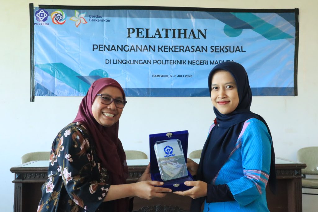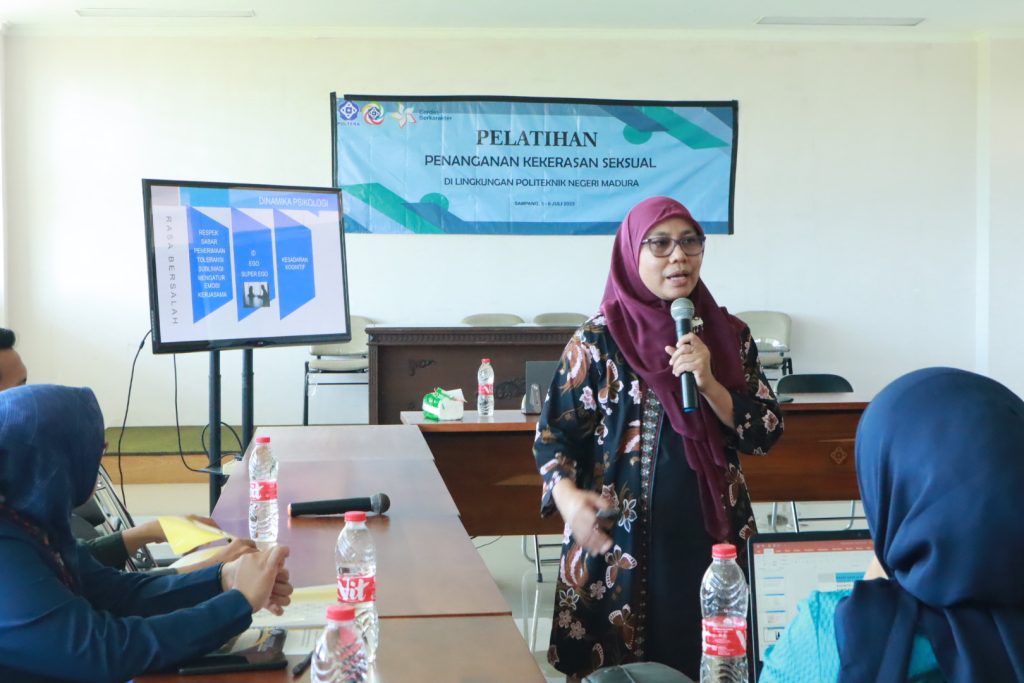Sampang – Politeknik Negeri Madura Menyelenggarakan Pelatihan Penanganan Kekerasan Seksual di Lingkungan Poltera pada tanggal 05-06 Juli 2023 dimulai pukul 08.00-16.30. Pelatihan ini dilaksanakan di Ruang Rapat Gedung B Politeknik Negeri Madura yang dihadiri oleh Wakil Direktur Bidang Kemahasiswaan dan Akademik M. Musta’in, M.T., Wakil Direktur Umum dan Keuangan Tristiandinda Permata, S.T., M.T., 9 Anggota Satgas PPKS, 2 orang perwakilan dari SPI, 2 orang perwakilan dari duta kampus, 2 orang perwakilan dari BEM dan 1 orang dari UKM Jurnalistik. Acara diawali dengan sambutan dari Ketua Satgas PPKS, Elisa Christiana, M.Keb., yang menyampaikan ucapan terimakasih kepada peserta yang hadir serta tujuan dari diselenggarakannya pelatihan ini.